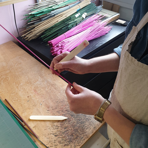 Lucie utilise exclusivement de la paille de seigle, une paille française cultivée uniquement pour ses brins. J'ai pu observer les principales étapes de fabrication d'un bijou. Après avoir ouvert la paille, la créatrice l’écrase avec un plioir en bois, en plastique ou en os pour obtenir un ruban végétal. Puis, sur une base de medium (poudre de bois aggloméré collée), elle colle délicatement chaque brin. L’excédent est retiré au cutter. Chaque morceau est ensuite fixé côte à côte, l’un après l’autre selon un remarquable jeu de couleurs qui crée le rendu graphique et élégant caractéristique de la marque. Les motifs peuvent être en forme d'éventail, de soleil ou de chevron (aussi appelé point de Hongrie). L'étape finale consiste à fixer les apprêts métalliques en plaqué or ou en argent 925 palladié.
